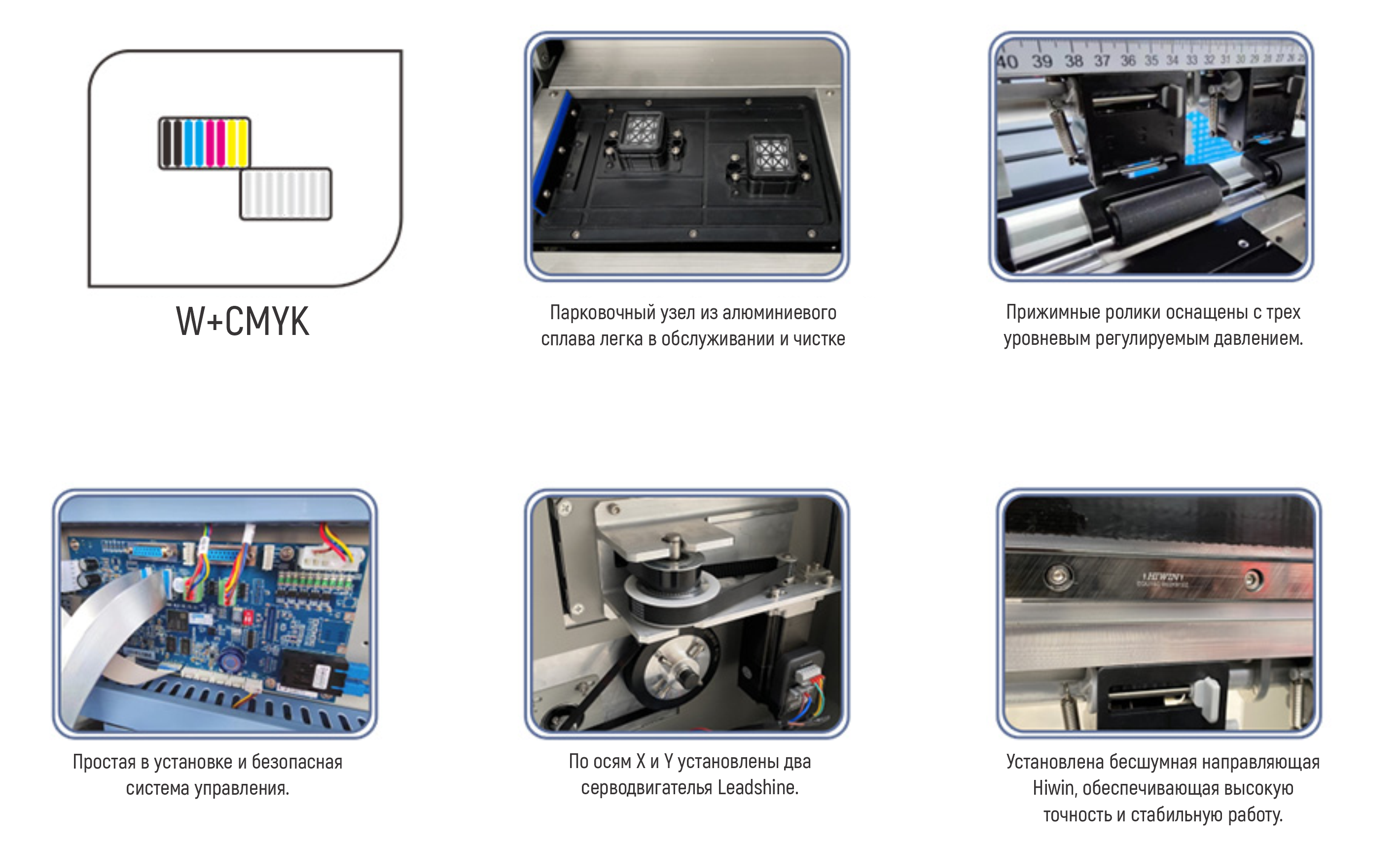 - Система циркуляции белых чернил и автоматической прочистки сопел
